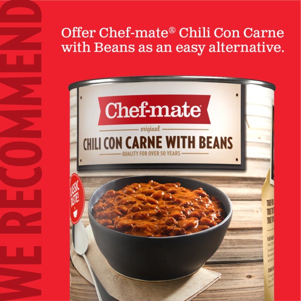 CHEF-MATE products make meal versatility easier than ever. See how you can make your food and beverage offerings even more mouthwatering with ideas that feature CHEF-MATE Chili Con Carne without Beans and our other easy-to-prep products by viewing our recipe page.