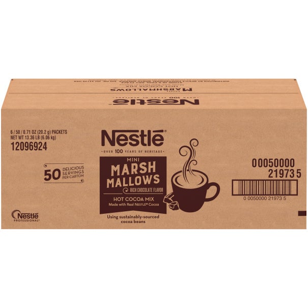 Nestlé Hot Cocoa Rich Chocolate Flavor with Mini Marshmallows is a rich-tasting, sweet hot cocoa mix with mini marshmallows that creates a rich and indulgent chocolate flavor. Made with real Nestlé cocoa using sustainably-sourced cocoa beans, our hot chocolate is part of the Nestlé Cocoa Plan to promote better farming, better lives and better cocoa. This product was created to meet Nestlé Nutritional Foundation criteria, which sets targets for responsible levels of nutrients such as added sugar. Just add hot water or milk and treat yourself to a delicious, 99.9% caffeine-free, 6-8 ounces cup of cocoa. Nestlé Hot Cocoa comes in a dispenser box of 50-count cocoa sachets to keep the counter clean and organized. Single serve hot cocoa packets are perfect for offices, cafeterias, restaurants and more. Kosher Dairy. Nestlé Hot Cocoa is the cocoa brand with over 100 years of heritage, providing a creamy hot chocolate that your customers have come to trust and love.
