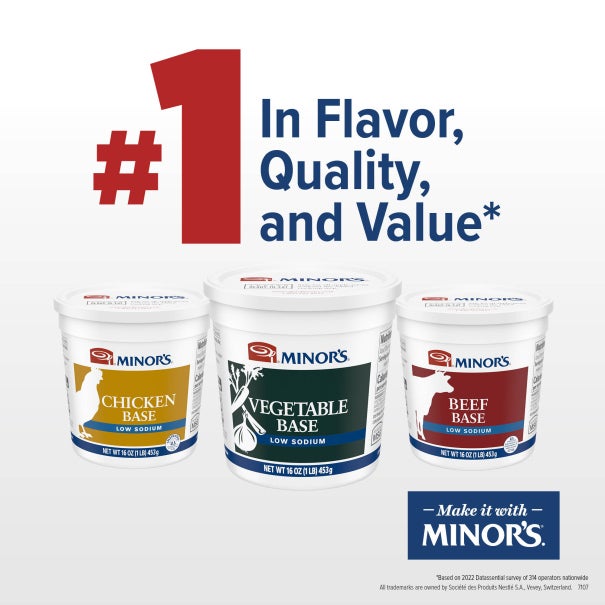 To make a fully seasoned stock or broth, add 1 lb of Minor's base to 5 gallons of water. For other portions, see additional ratios in the "Preparation & Storage" tab.