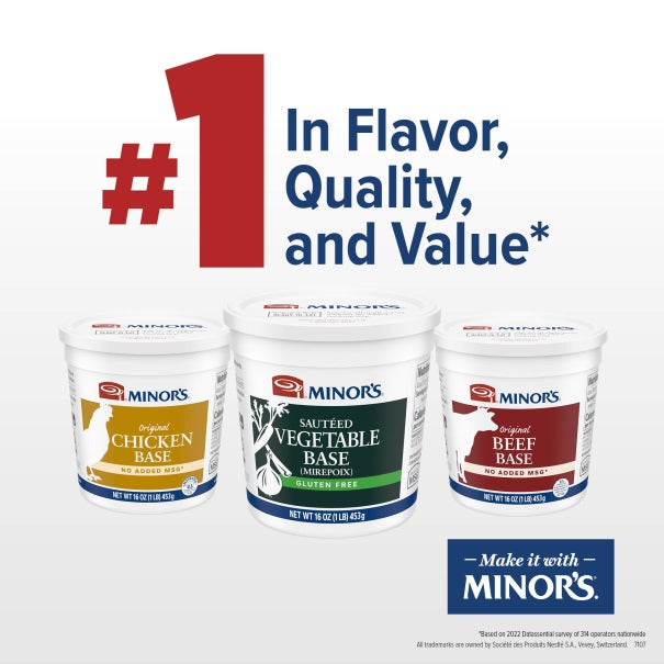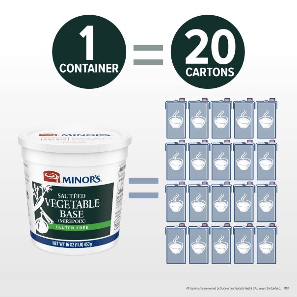 To make a fully seasoned stock or broth, add 1 lb of Minor's base to 5 gallons of water. For other portions, see additional ratios in the "Preparation & Storage" tab.