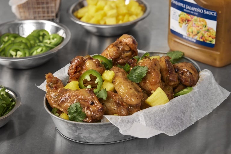 PINEAPPLE JUICE CONCENTRATE, WATER, SUGAR, JALAPENOS, APPLE CIDER VINEGAR, MODIFIED FOOD STARCH, LEMON JUICE CONCENTRATE, 2% OR LESS OF GINGER PUREE, GARLIC PUREE, SALT, ONION POWDER, SPICE, NATURAL FLAVOR.