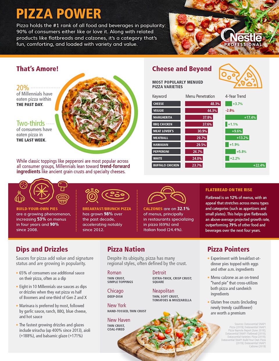 Chart the Success of Pizza and Calzone Pizza, calzone, and flatbread are just about everyone’s favorites. Discover what flavors, sauces, and dips are trending right now in this Infographic pie chart.
