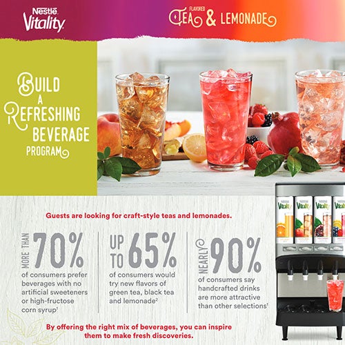We believe you and your guests should have a beverage service experience that is as simple and satisfying as the beverage itself. That’s why Nestlé Vitality® Express has proprietary engineering for minimal cleaning and labor, helping you serve a wide variety of cold, delicious juice, lemonade, enhanced water and iced tea choices.
