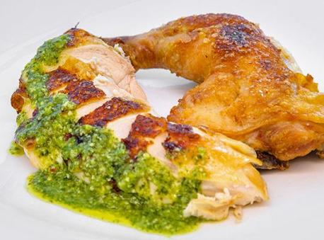 Brick-Style Chicken with Za’atar Infused Basil Pesto and Pickles