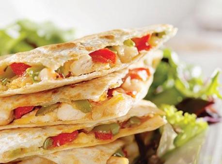 Assembly for 1 quesadilla: Place tortilla on griddle and grill 30 seconds. Place 1/2 cup prepared Cheese Sauce on tortilla. Top with 4 oz. of chicken and chili mixture and 1/4 cup onions. Cover with second tortilla.