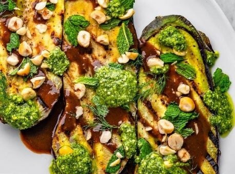 Eggplant Steaks with Pesto Yogurt and 'Steak' Sauce