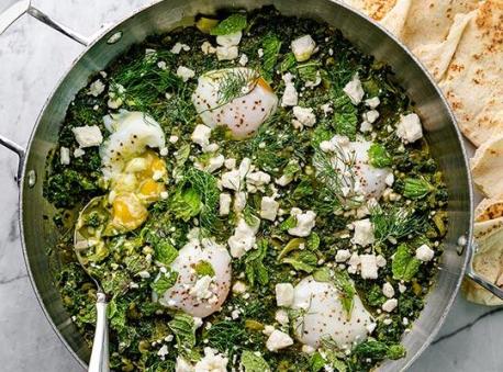 5Garnish the shakshuka with the fresh herbs and crumbled feta.