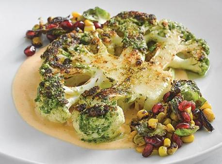 Elevate your vegetarian grilling game with this delicious and flavorful grilled cauliflower steak with pesto. Thick slices of cauliflower are marinated, grilled to perfection, and topped with a vibrant and herbaceous pesto sauce, creating a satisfying and nutritious dish. Grilled cauliflower steak is glazed with pesto and served with a mixture of crispy Brussels sprouts, pomegranate, and corn along with a schmear of smoky chipotle crema. Garnish the grilled cauliflower steaks with a sprinkle of toasted pine nuts and a few fresh basil leaves for an extra touch of elegance. Serve them as a main course or as a flavorful side dish alongside grilled vegetables or a salad.