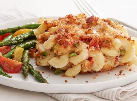 3Serve the Jumbo Mac and Crab Cake topped with 1 fl. oz. Mornay Sauce and 3 pieces of grilled asparagus spears and 2 oz. of halved tri-colored cherry tomatoes on the side.