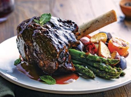 5Add 1 lamb shank to the plate and sauce with minted brown gravy. Garnish with additional mint leaves to taste.