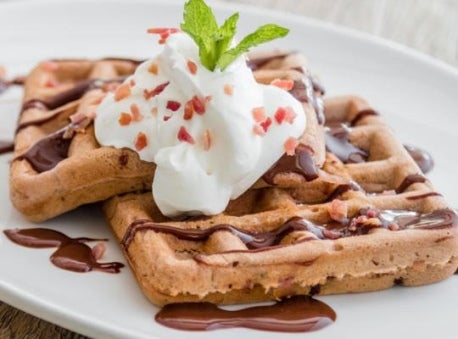 To assemble waffle: Top with 1 Tbsp. of Coffee-mate whipped cream, bacon bits, and drizzle with 1 Tbsp. of coffee chocolate syrup.