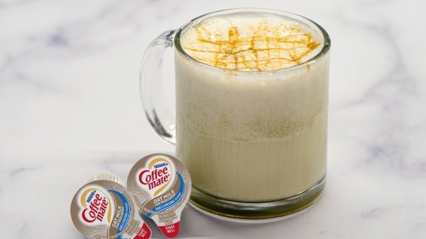 1To the bottom of the serving cup, add salted caramel sauce, green apple syrup, and Coffee-mate Natural Bliss Oatmilk Vanilla Creamer