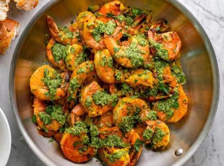 Return the cooked shrimp to the mixture, and heat through. Add basil pesto and fold to combine.