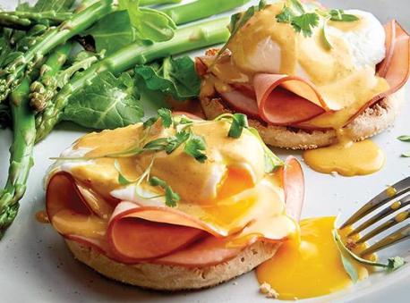 2To build, place a piece of Canadian bacon on top of each half of English muffin, followed by a poached egg, then top with the Tikka Masala Hollandaise.