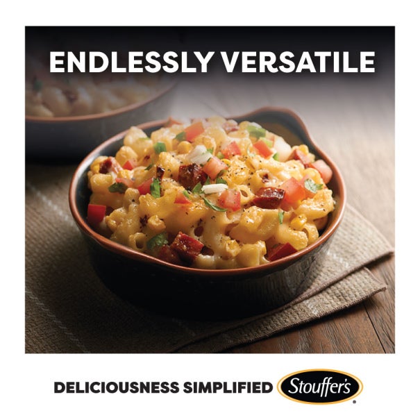 We recommend you add assorted veggies, meats, breadcrumbs and flavor concentrates to customize your mac and cheese dish. Here are a few suggestions. Grecian-Feta: Cheese, spinach, Kalamata olives and Minor's Roasted Garlic flavor concentrate; Philly-Sliced Steak: Caramelized onions and breadcrumbs, Western-Peppers, Minor's Roasted Garlic Flavor Concentrate, onions and ham topped with breadcrumbs; BLT: Diced bacon, diced tomato, and shredded lettuce; Southwest: Toss with Minor's Chipotle Flavor Concentrate bacon and chives; Italian: Toss with peas and prosciutto topped with Stouffer's Alfredo and parmesan cheese; Reuben Mac and Cheese: Top with sliced corned beef, sauerkraut and Swiss cheese; Mushroom and Swiss: Top with sautéed mushrooms, Minor's Mushroom Base and Swiss cheese; Turkey Club: Top with sliced turkey, bacon, diced tomato, Minor's Turkey Base and breadcrumbs